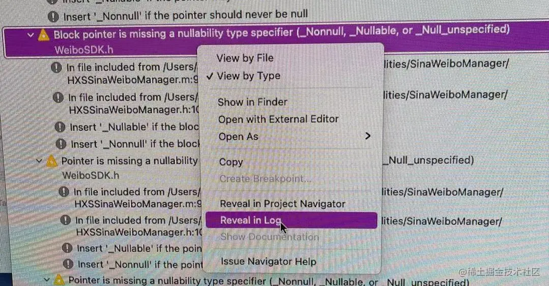 1. 右键警告,选择“Reveal in Log”