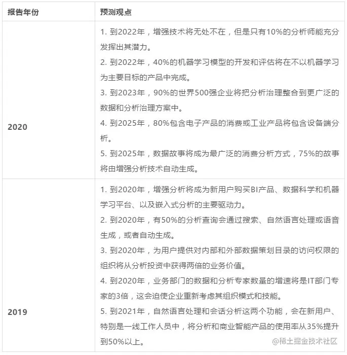 结合报告的预测观点和市场描述,不难看出增强分析(Augmented Analytics)和企业报告是分析与BI平台的主要趋势。报告认为,分析与BI平台的差异将不再体现在其数据可视化功能上,这些功能正在成为“日用品”,而差异化正在转向企业报告功能的集成支持和增强分析上。