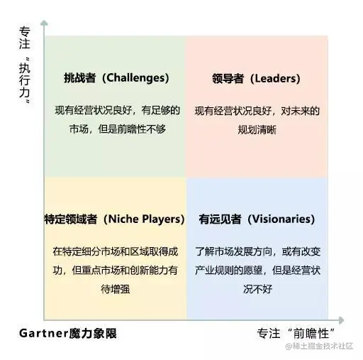 魔力象限是Gartner对行业中的供应商进行评估比较的一个工具,主要通过一套标准的方法,基于行业市场中各供应商的执行力和前瞻性表现,生成魔力象限图和相应的分析报告。