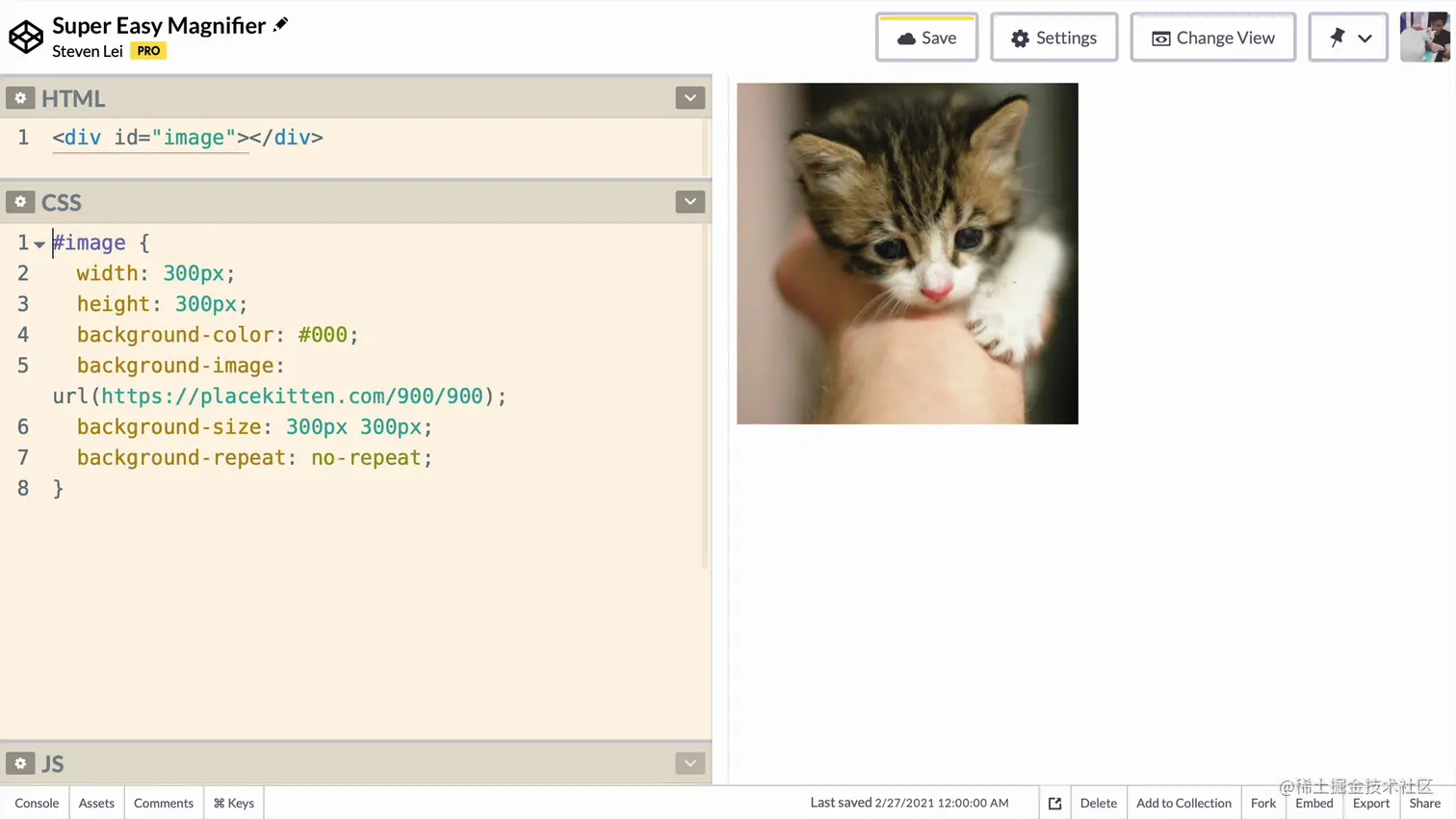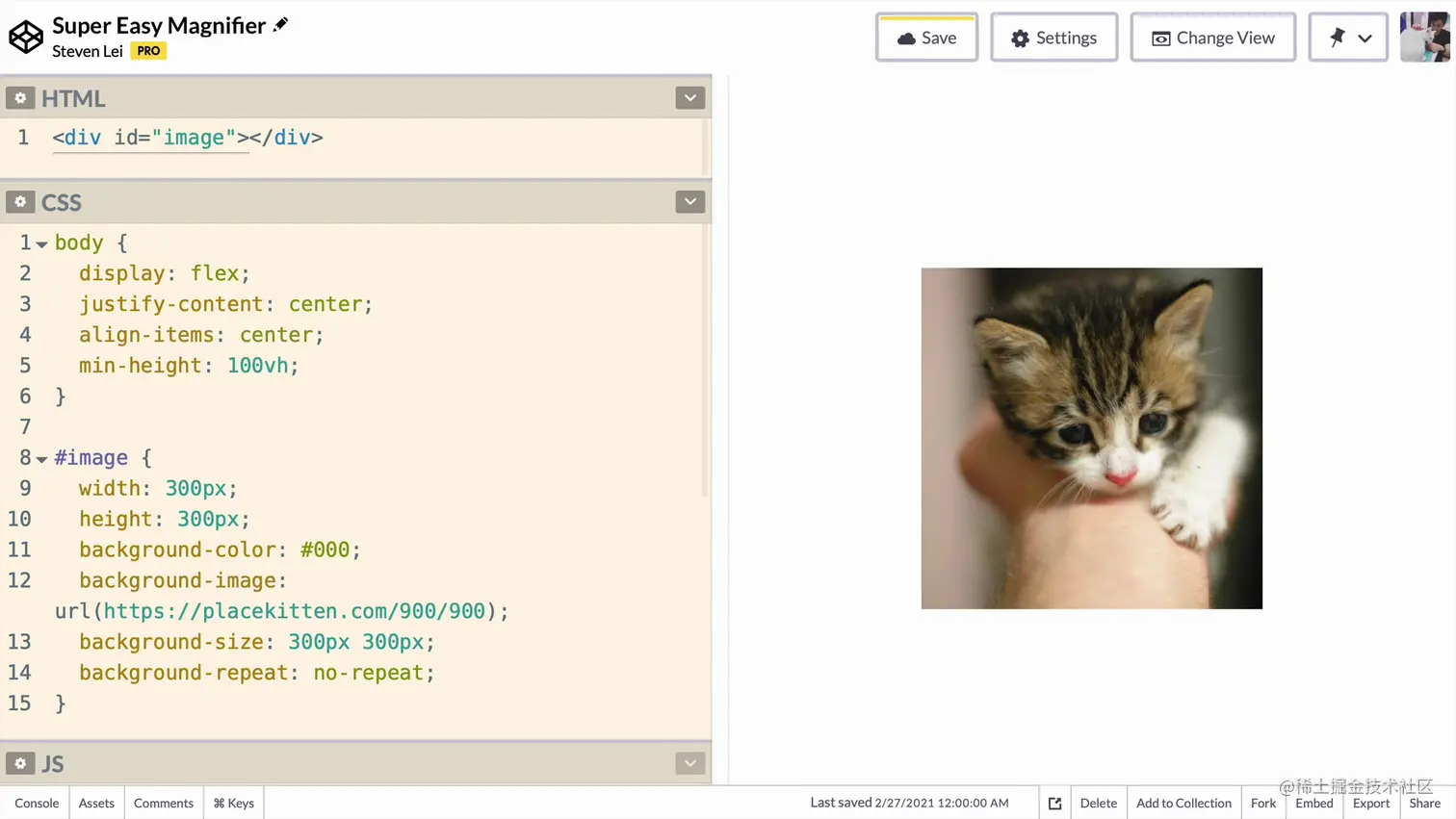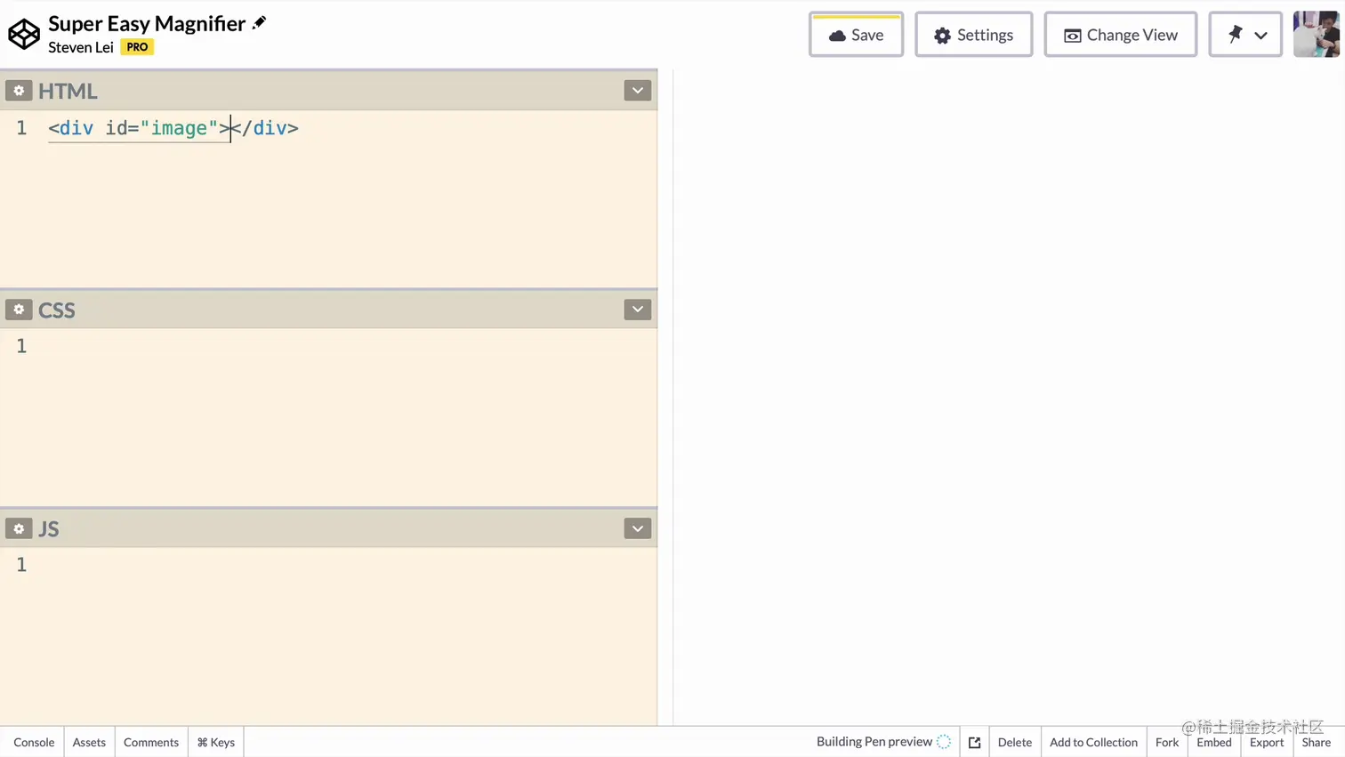 打开 CodePen 编辑器,在 HTML 的部份加入一个 <div>,id 名为 image。