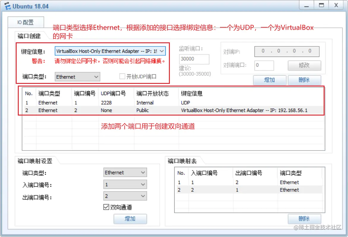 端口增加完成后,在端口映射入端口和出端口选择不同端口(顺序不影响),然后勾选双向通道,单击”增加“,此时端口映射表会增加一对端口。