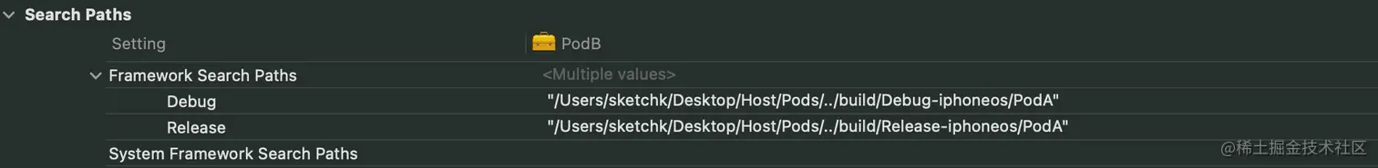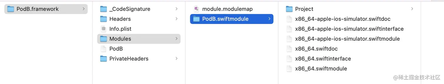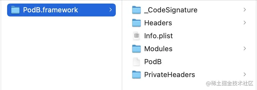例如,对于 PodA 组件而言,它自身依赖 PodB 组件,在使用原先的构建方式时,我们需要拉取 PodB 组件的完整 Framework 产物,这会包含 Headers 目录,Modules 目录里的必要内容,当然还会包含一个二进制文件(PodB),但在实际编译 PodA 组件的过程中,我们并不需要 B 组件里的二进制文件,而这让拉取完整的 Framework 文件显得多余了。