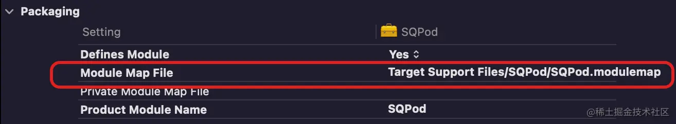 而当你的组件里如果压根就没有 Objective-C 代码的时候,你可以将 Build Setting 中 Packaging 里 Defines Module 参数设置为 NO,它的编译参数为 DEFINES_MODULE, 此时不会生成 <ProductModuleName>.modulemap 类型的文件。