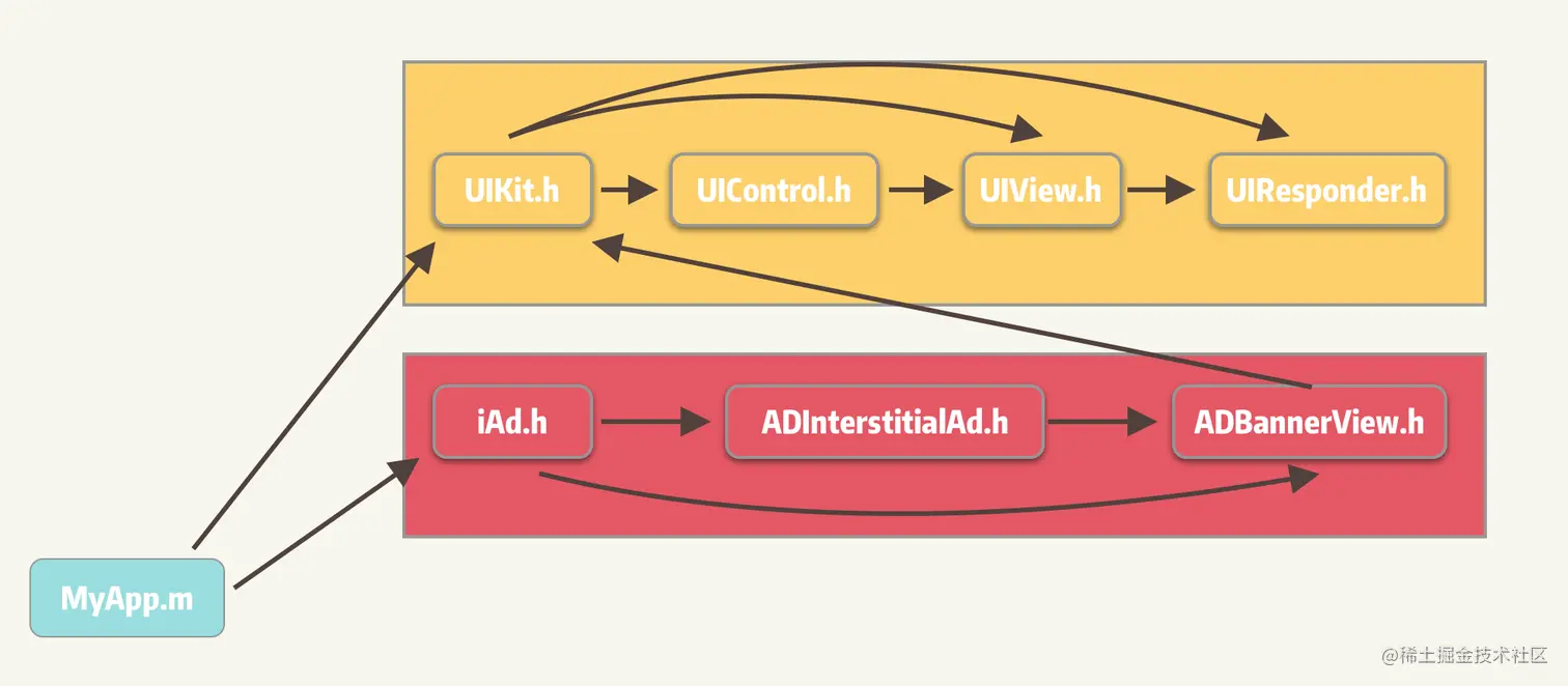 假设在 MyApp.m 文件中,我们 #import 了 iAd.h 文件,编译器解析此文件后,开始寻找 iAd 包含的内容(ADInterstitialAd.h,ADBannerView.h),及这些内容包含的子内容(UIKit.h,UIController.h,UIView.h,UIResponder.h),并依次递归下去,最后,你会发现 #import <iAd/iAd.h> 这段代码变成了对不同 SDK 的头文件依赖。