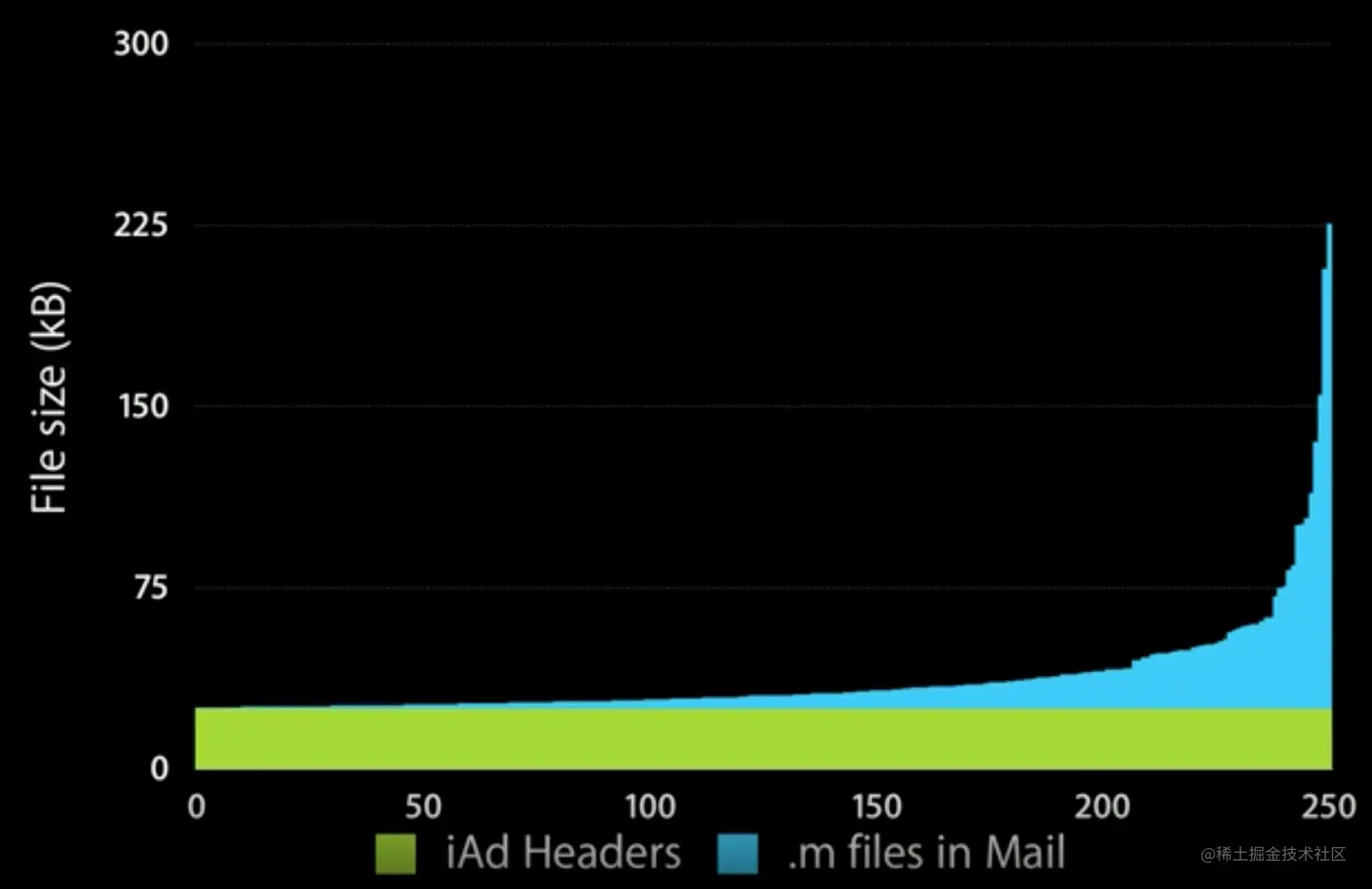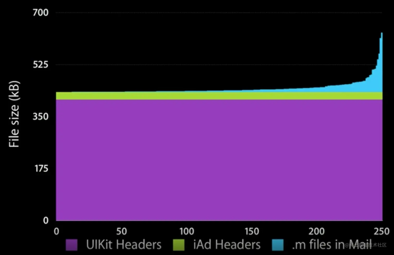 Apple 公司对它们的 Mail App 做过一个分析,下图是 Mail 这个项目里所有 .m 文件的排序,横轴是文件编号排序,纵轴是文件大小。