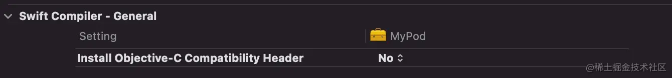 例如当你的 Swift 组件不想暴露自身的 API 给外部的 Objective-C 代码使用的话,可以将 Build Setting 中 Swift Compiler - General 里的 Install Objective-C Compatiblity Header 参数设置为 NO,其编译参数为 SWIFT_INSTALL_OBJC_HEADER,此时不会生成 <ProductModuleName>-Swift.h 类型的文件,也就意味着外部组件无法以 Objective-C 的方式引用组件内 Swift 代码的 API。
