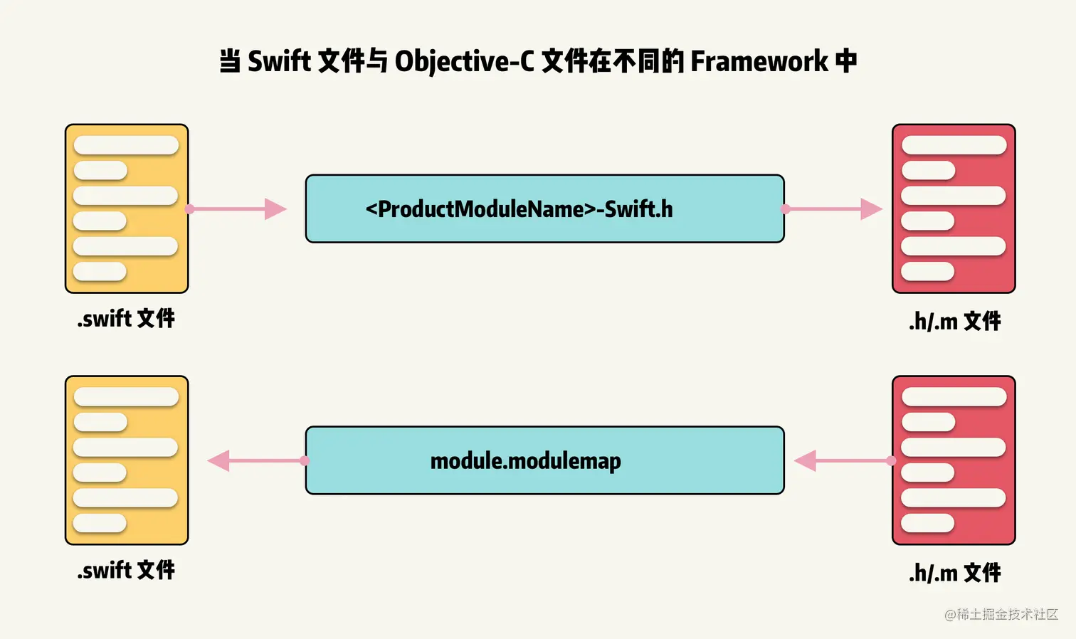 当 Swift 和 Objective-C 文件在不同 Target 中,例如不同 Framework 中,不同类型文件的 API 寻找机制如下: