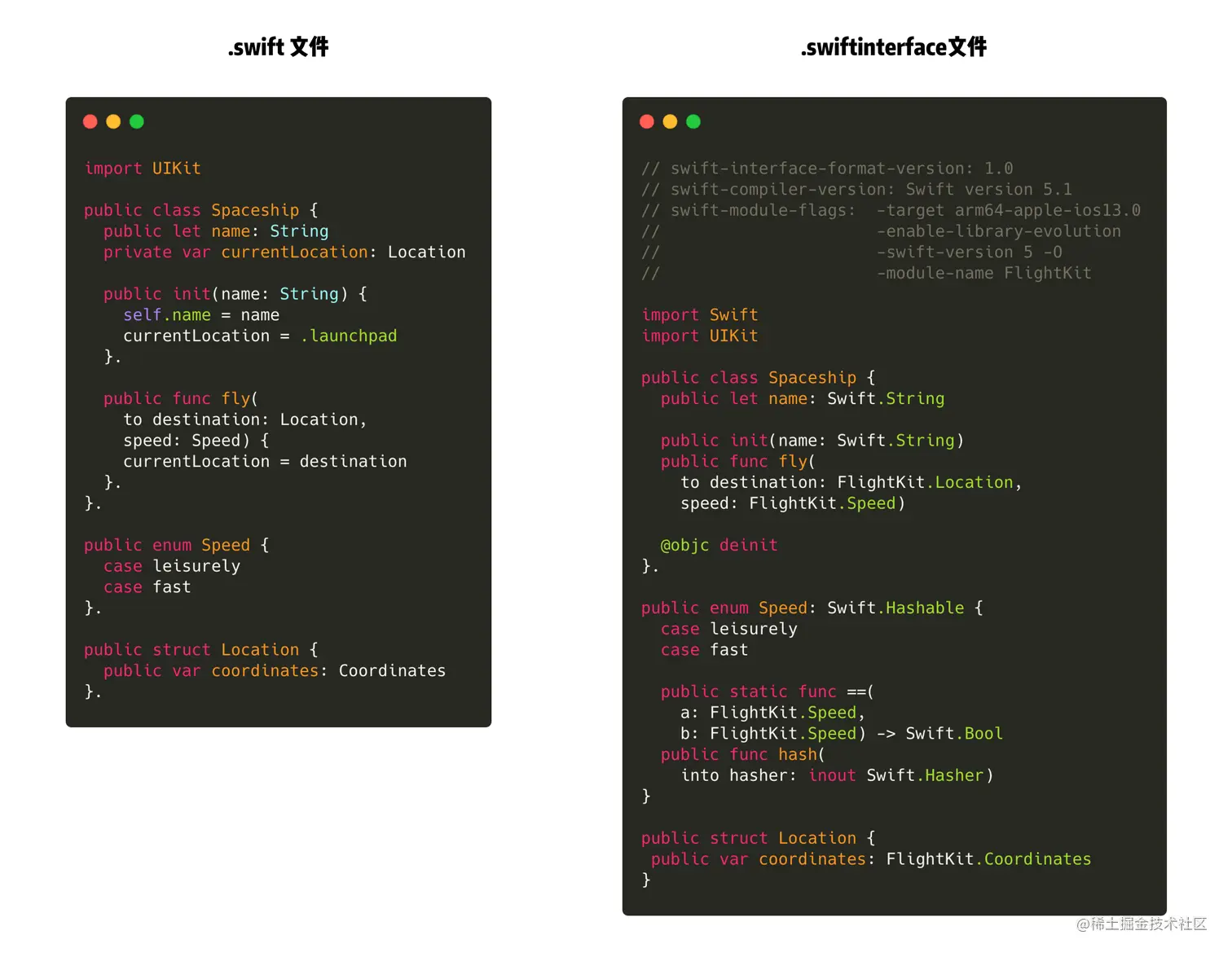 - 文件会包含所有隐式声明的方法,例如 Spacesship 的 deinit 方法 ,Speed 的 Hashable 协议。