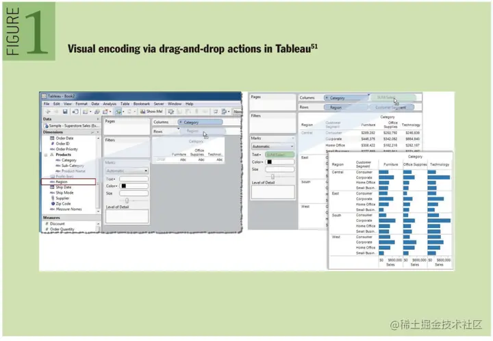 分析师把数据变量拖拽到货架(代指载⼊数据进⾏视觉编码的控件)上。这样的⽅式增强了表