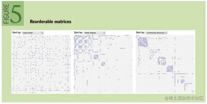 架构(例如聚类)。图5中的例⼦,是⼀个基于矩阵的社交⽹络数据可视化。 左边的矩阵中,
