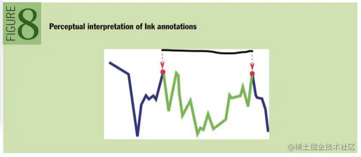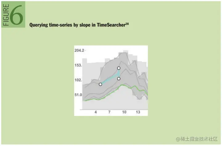 设计一种具有表现力的选择方式一直是一个热门的研究领域。举个例子,研究者提出在一个时序可视化上匹配鼠标动作的方法,用来选择一些感觉上很显著的数据,像峰值、谷底、斜坡(如图8),或者来查询随时间变化的复杂形式。初始的选择可以作为更复杂选择的起点,正如分析师可能先选了一个代表性的项目,然后基于其属性构建了一个查询条件(例如选择所有和这个项目一样的蓝色项目)。当然,选择不必限于鼠标键盘的操作:输入模式例如触摸、手势、对话都有可能产生新的选择模式。