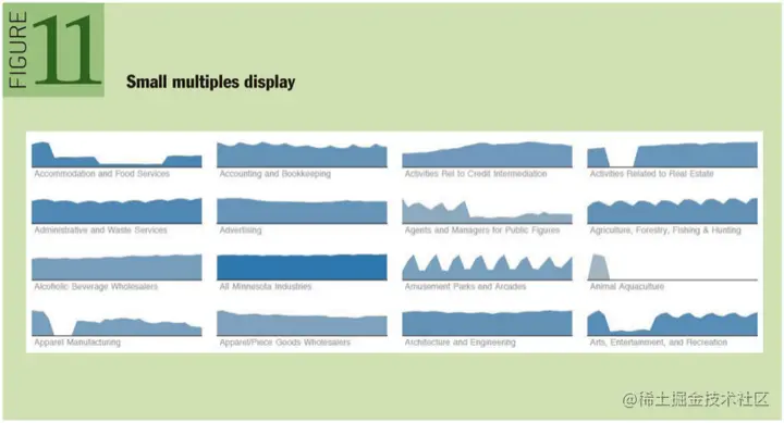 通过在一个视图中选取一个或一组项目,分析师将看到这样项目在其他视图中对应的项也被高亮显示(选中)。这种来探索多变量数据的有力方式,同样支持下钻到从属的组别、设置标签、导出选择项目。多视图显示可以促进对比,例如Edward Tufte提倡用小的多屏幕显示:他们是许多空间上相近的可视化图, 通常采用同样的度量和范围。 在图11中,这些小的多屏,也叫格子图,能够快速通过不同的数据维度和时间切片进行比较。这个可视化描述的是明尼苏达州经济部门提供的就业信息。这些重复的图表支持了在多个部门之间的对比。当然,将全部数据放在一个图里将会显得拥挤并使得个体的趋势变得模糊不清。