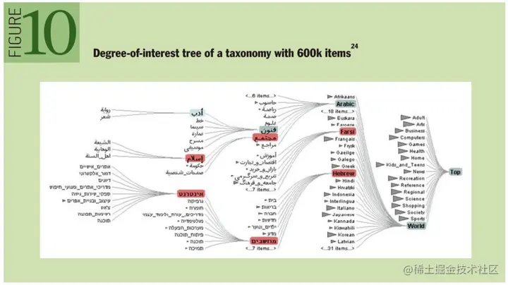 除了操控屏幕空间,焦点+上下文的方式可以直接应用于数据本身。其目的是辨认出哪些是当前高关注的数据(焦点),哪些是高重要性数据(不论是否是当前焦点),哪些是可以安全地从视图中移除的数据。DOI(兴趣度)基于对信息内容的整体重要性(比如有优先级的顶层类别、高度向心的节点)和当前兴趣(如被鼠标点击、检索或与其他兴趣项目相邻)进行打分。DOI分数的分布可以选择性地控制项目的可视性,基于现有视图尺寸和上下文的互动,如图10。
