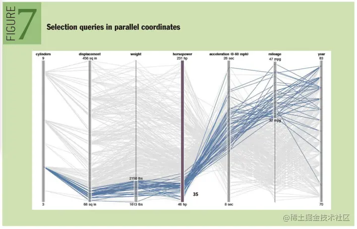 “选择”也会因为其表现力而变化多样。多数界面支持选择项目集合。尽管这种方式是容易实现的,但这并不能支持分析师去应用高级别的查询(筛选)标准。一种更强大的、但也更复杂的方式是将“选择”作为数据的查询一环。查询架构可以增加可视化应用的表现力。例如,在一个图表中的框选操作,可以是不直接选中所框选项目,而是通过所画的矩形框,确定要查询数据的X、Y轴坐标范围。查询所用的标准可以保存下来并应用在动态数据中(更新了的项目或许在或许不在设定范围内)或用于其他完全不同的可视化。例如股价的变化(在 TimeSearcher,如图6),和在平行坐标系中显示属性范围(如图7)。 在图6中一个角度选择工具指定了一个目标的斜率和其容限,因而查询时间范围内的有相似斜率的时间线都被选择了出来。被着色的区域显示了对最小值和最大值的包络。 这个小工具可以直接在可视化上进行操作:把它从左拽到右,可互动地查询其他时间窗口。图7中平行坐标系将多维数据通过线段形式在多个坐标轴上展现。分析师通过沿着坐标轴拖拽,来建立选择范围,高显所选择的项目(比如质量轻且里程高的汽车)。