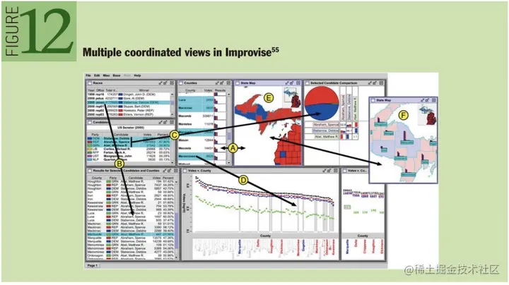 另外,多视图显示可以应用于多种可视化类型。例如频率直方图、散点图、地图、网络关系图,来展示多维数据集的不同映射方法。在图12中,分析师构建复杂拼接的互动表格、图形、地图来分析密歇根州选举结果。图中的注释揭示了被选择的数据是怎样在多个可视化视图中进行关联的。附带的图例、直方图的滑块、带有高亮标志的滚动条支持提供数据的多维视角。