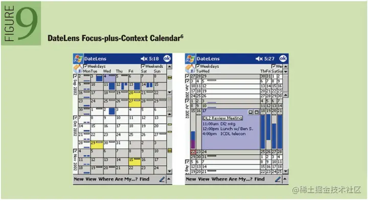当然,一开始就进行总览,并不总是适用的。一个对即将发生的审判而进行的法律分析的研究者,可能会放弃对整个美国历史案件审判的查询,转而去分析与当前案件相关的审判案例。他会使用关键词搜索,并把考察范围拓展到其他引用这些审判结果的案例。这样的模式可以总结为:先搜索,然后显示内容,在根据需要进行扩展。在任何时候,可视化都将作为信息空间的观察窗,分析师通常会利用它们进行导航。常见的例子包含了通过滑动条或鼠标拖拽进行的滑动或平移、用缩放滑杆实现不同层级视图的切换,以及用转盘进行旋转。缩放并不需要严格按照几何上的含义:语义缩放能够在调整放大级别时,让分析师看到不同的的信息量。图9中的日历中,随着分析师从月到日到小时的导航过程,被选择区域也扩大了,语义缩放使它展示了更多的内容。另外,动态查询工具,如散点图x、y轴的范围滑块