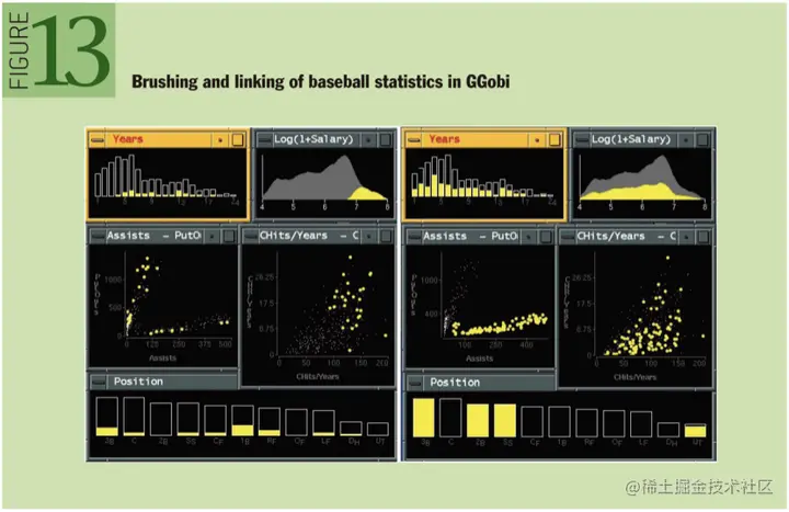 多重视图显示也能够实现跨视图的交互式探索。刷动和链接是实现在一个视图中选择项目、在其他视图中也高显这个项目的实现方式。图13中,棒球项目分析师选择了一个图中的一项,这个项在其他视图中的对应项也被高显出来了。在左边,选择高收入玩家揭示了这个群体对职龄和守卫能力的低依赖,以及与击球表现的关联。在右边,选择那些助攻多于接杀的玩家,显示了其对位置的强依赖。可见每个可视化视图都是揭示整个数据模式的输入通道。关联式的选择支持多维度的推理,通过让分析师看到一个视图中的模式是如何投射到其他视图。分析师可能通过多种方式来协调视图:在一个视图中选择项来高显该项在其他视图的对应项,或者是提供筛选标准来过滤其他屏幕的信息。关联式导航也为视图协调提供了另外的形式,当一个视图进行缩放、平移时,其他视图也发生对应操作。尽管比较多个可视化要求观察者要协调好注意力,并在心理上整合各个视图的图案,这种方式还是比在单一视图上加载多个维度的数据要高效。