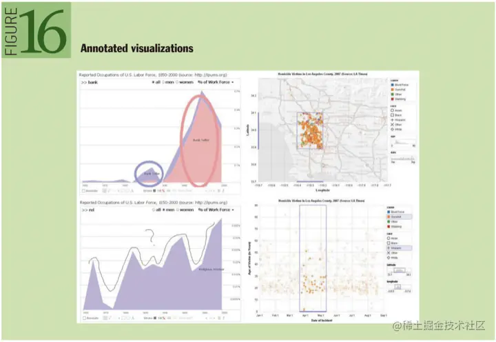 当系统能够辨识到一些操作,例如“选择”时,注释可以是理解数据的。如图16,在右侧顶部图上,选择查询器绑定了犯罪数据的注释。右侧底部展示了当数据编码发生变化时,注释的变化:选中的地理区域目前已转变为使用频率直方图滑块。这些“选中”可表现为一些被选中的项目或者声名性的查询,或者两者都有。“理解数据的”标注允许“点选”这样的意图在视图变换后仍然可以保持原先的状态,也就是说它能够跨越同一数据的不同可视化视图而保持存在。这是一种机器能够理解的标注,可以用来导出选择的数据,或者用于聚合来辨认高兴趣区域。