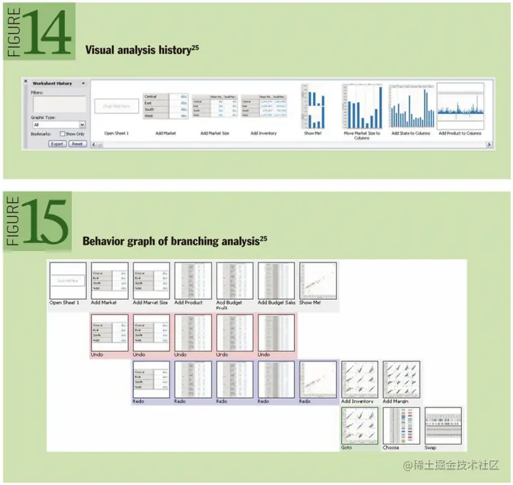 为了支持迭代式的分析,可视分析工具应该能记录交互历史。至少是, 能够提供“撤销”和“再做”。低阶的输入例如鼠标和键盘事件是容易捕捉的,而当用户要记录有语义的高阶行为时,历史功能就显得很重要了。通过对用户行为的建模(指的是视图指定、分类、过滤、缩放),更加丰富的记录将被建立并可视化出来。