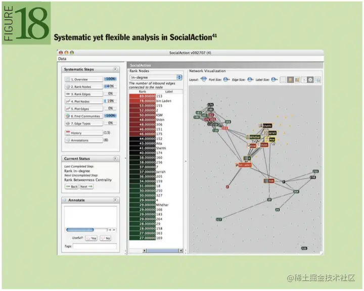 有些分析过程是清晰的线性过程,但是很多可视分析任务需要系统化且灵活的步骤,让分析师在踏上分析的长途中能够追踪到他们已经完成的任务。举个例子,“SocialAction”组织了一些列社交网络分析(通过节点排序、节点绘制、找寻社区),系统允许分析师选择性跳过一些步骤,同时对自己已经完成的步骤进行记录。图18中,左侧的看板展示了社交网络分析的通常步骤并提供了进度指示。相关地,专家会开发一些可视化工具给专业度不高的用户使用。这就如同电子数据表格里的宏一样,让专家把一些如会计和其他商业实践步骤给程序化。许多的研究都旨在定义一些有效的可视分析步骤,从而输出可复用的工作流程。