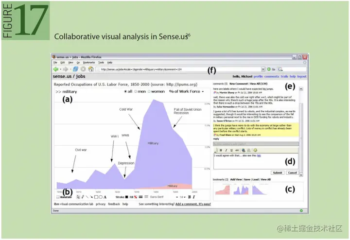 对可视分析的研究通常聚焦在单个分析过程的感知和认知问题上。在实践中,分析往往是一个社会化的过程,包括了对结果的多重解读、讨论、散播。这个意图是很清楚的: 为了支持全生命周期的分析,分析系统要支持社会化的交互。至少是支持视图的输出或数据集的导出、分享和再访问。一个重要的能力是输出控制面板的分析设置,让其他分析师来看同样的可视化。 图17 展示了 Sense.us 的协作可视分析工具的视图分享、标注、讨论功能。这个系统由交互式可视化(a)、一套图形标注工具(b)、书签的缩略图(c)、添加文字评论用的输入框(d)、对当前视图文字评论(e)和可以随着可视化状态而自动更新的可分享的URL(f)。