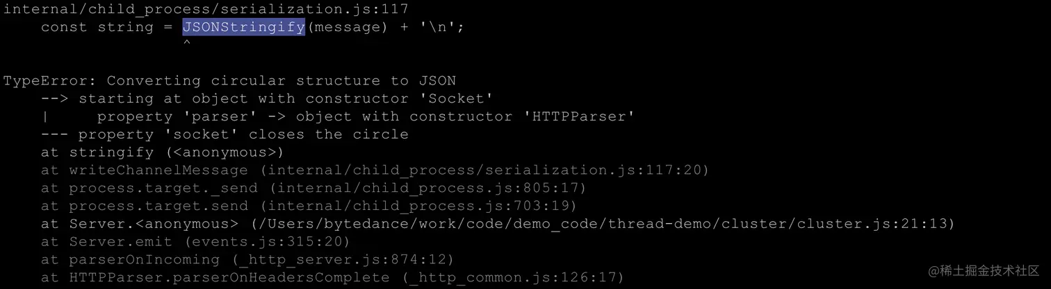 通过 process.send,子进程可以给主进程发送信息,发送的信息可以是字符串,或者是可以进行 JSONStringify 的对象。而如果一个对象不能 JSONStringify,则会报错,比如下面这段代码。