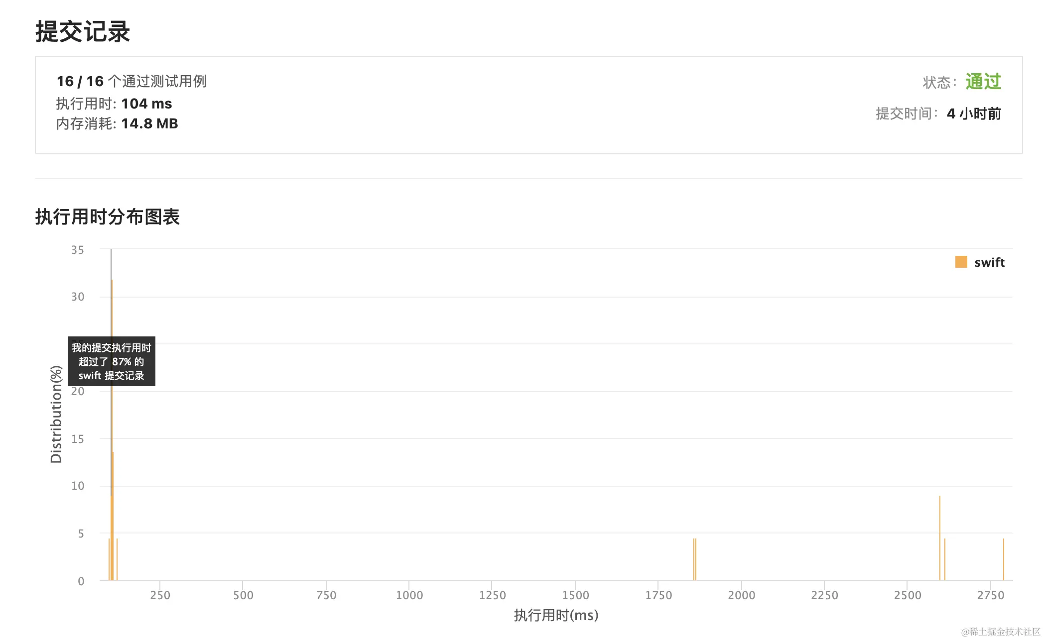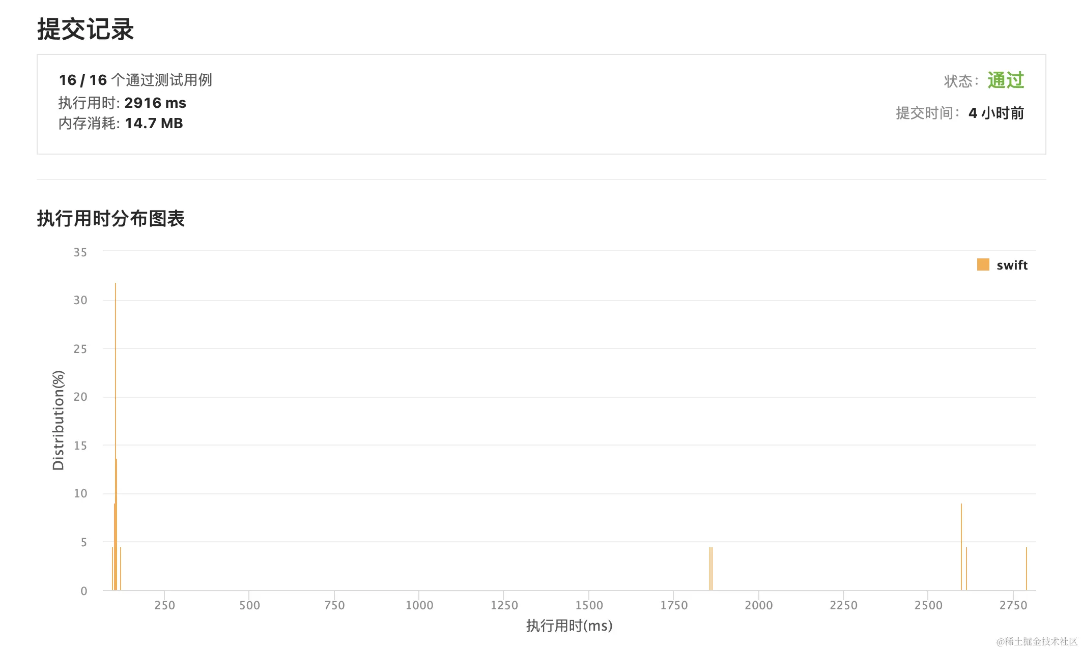 运行耗时2916ms,与其他swift代码相比明显耗时多了不少,考虑优化代码以降低时间复杂度