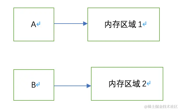 A和B指向的不是同一块内存区域,只是这两块内存区域中的内容是一样的,即为深拷贝。