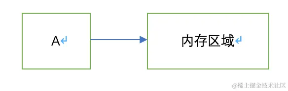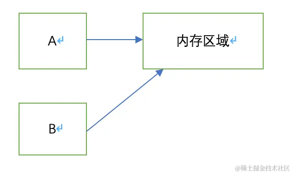 首先A指向一块内存区域,现在设置B = A