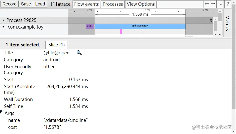 com.example.toy-29825 [000] ...1 264266.290444: tracing_mark_write: B|29825|@file@open|name=/data/data/cmdline;cost=1.5678