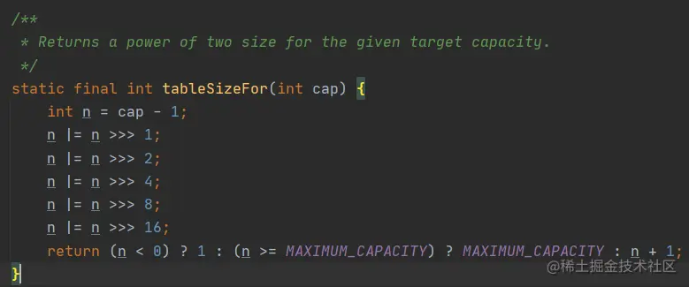 它在HashMap的给定初始化容量的构造函数中调用,将用户给定的容量变为至少大于它的2的n次幂。