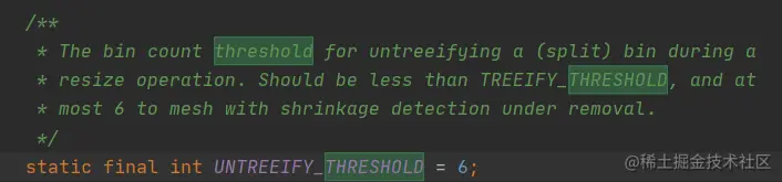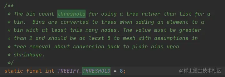 桶中的链表元素大于这个值且数组的长度大于64时会转化为红黑树结构