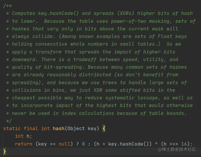 为什么不用key本身的hashcode方法,而又处理了一下。当table很小的时候,计算元素在table中的位置(n-1)&hash(在put方法中利用这条式子求该key在HashMap的table中对应的下标),只用到了hash值的低位,这样当不同的hash值低位相同,高位不同的时候会产生冲突。实际上的hash值将hashcode低16位与高16位做异或运算,相当于混合了高位和低位,增加了随机性