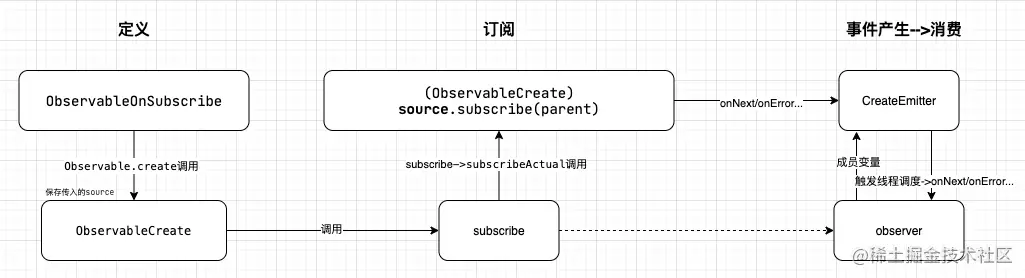 在解析代码之前, _大家可以先对ObservableCreate、subscribeActual、subscribe这几个关键词有印象,后续会有详细的解析。