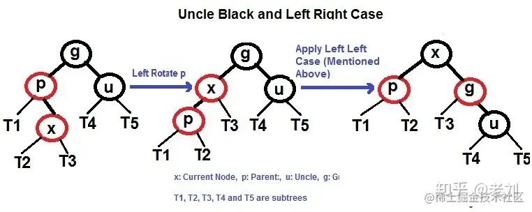 左右 (P 是 G 的左孩子,并且 X 是 P 的右孩子)