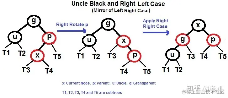 当前节点是其父节点的右节点,其父节点是其祖父节点的右节点