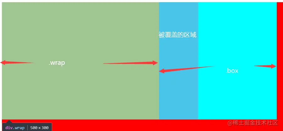 可以看到.wrap设置margin-right:-100px; wrap元素凹进去100px,margin负值不会脱离文档流,所以后续box元素认为前面空了100px,就会覆盖wrap元素100px