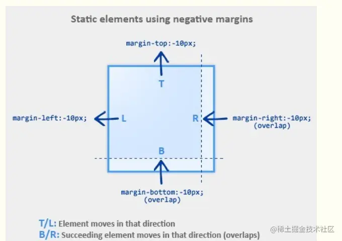 当static 元素的margin-top/margin-left被赋予负值时,元素将往指定的方向移动