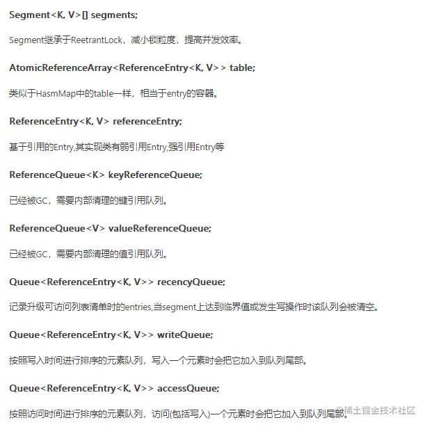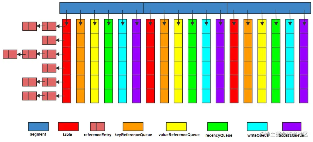 LocalCache为Guava Cache的核心类,先看一个该类的数据结构: LocalCache的数据结构与ConcurrentHashMap很相似,都由多个segment组成,且各segment相对独立,互不影响,所以能支持并行操作。每个segment由一个table和若干队列组成。缓存数据存储在table中,其类型为AtomicReferenceArray。