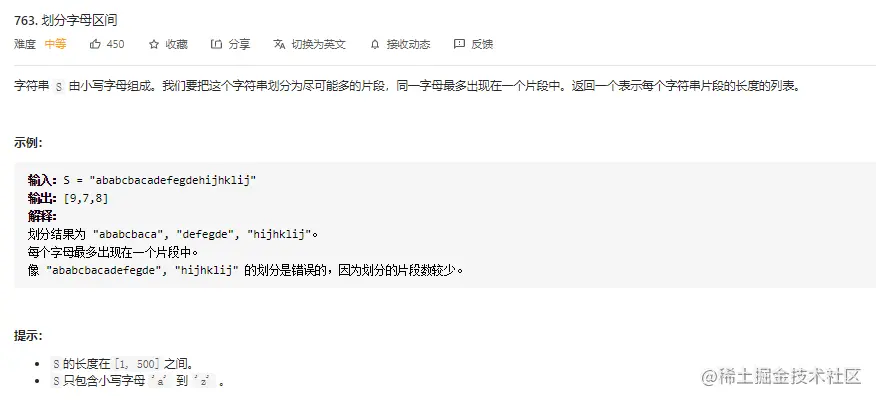 由于同一个字母只能出现在同一个片段,显然同一个字母的第一次出现的下标位置和最后一次出现的下标位置必须出现在同一个片段。因此需要遍历字符串,得到每个字母最后一次出现的下标位置