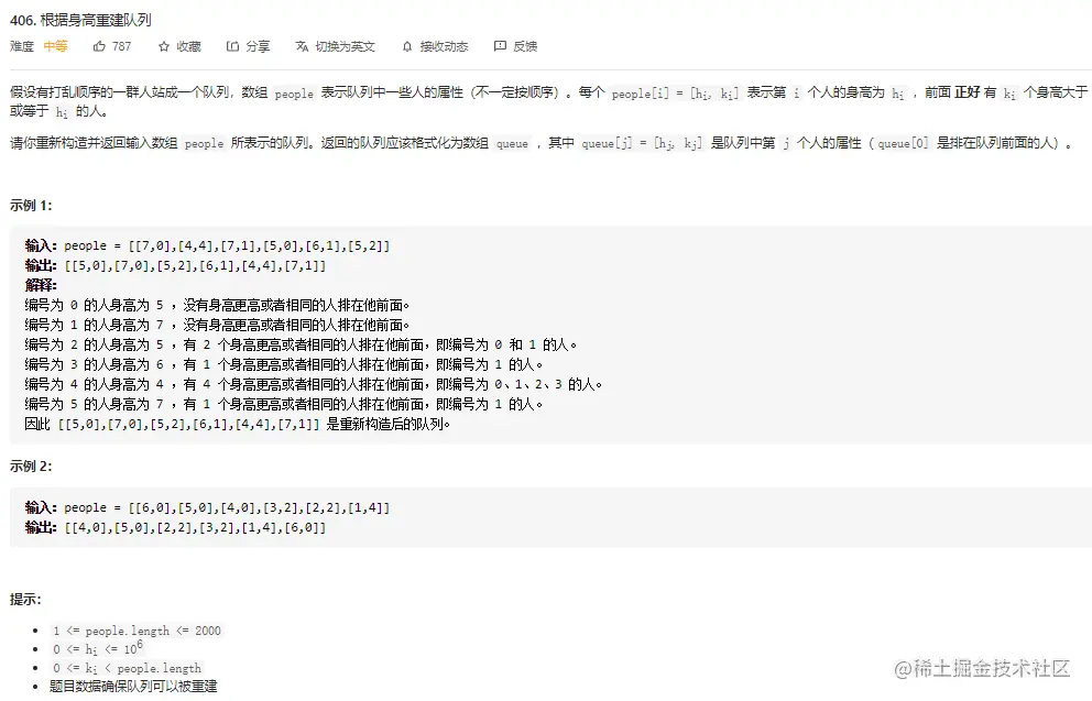 按照身高来排序,一定要从大到小排(身高相同的话则k小站前面),则排序后前面的节点一定比当前的节点高,那么当前节点可以放心插到下标为n的位置,这样就确定了当前节点前面一定有n个比它高的元素