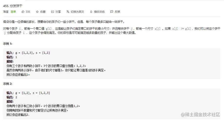 思路: 把孩子和饼干排序,给最小饥饿度的孩子分配最小的能饱腹的饼干。