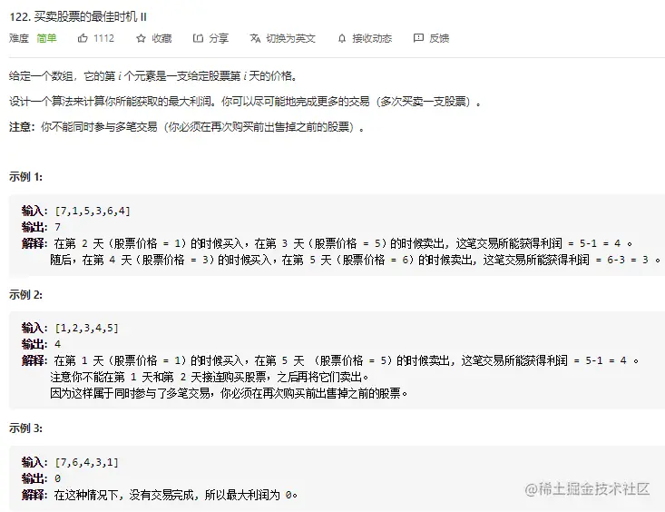 思路: 如果所有上涨交易日都买卖,所有下降交易日都不买卖,一定是利益最大化的,所以可以把所有的上坡全部收集到。把可能跨越多天的买卖都化解成相邻两天的买卖,等价于每天都在买卖,(注意计算的过程并不是实际的交易过程,4 次买入和 4次卖出,等价于在第1天买入,第5天卖出。)