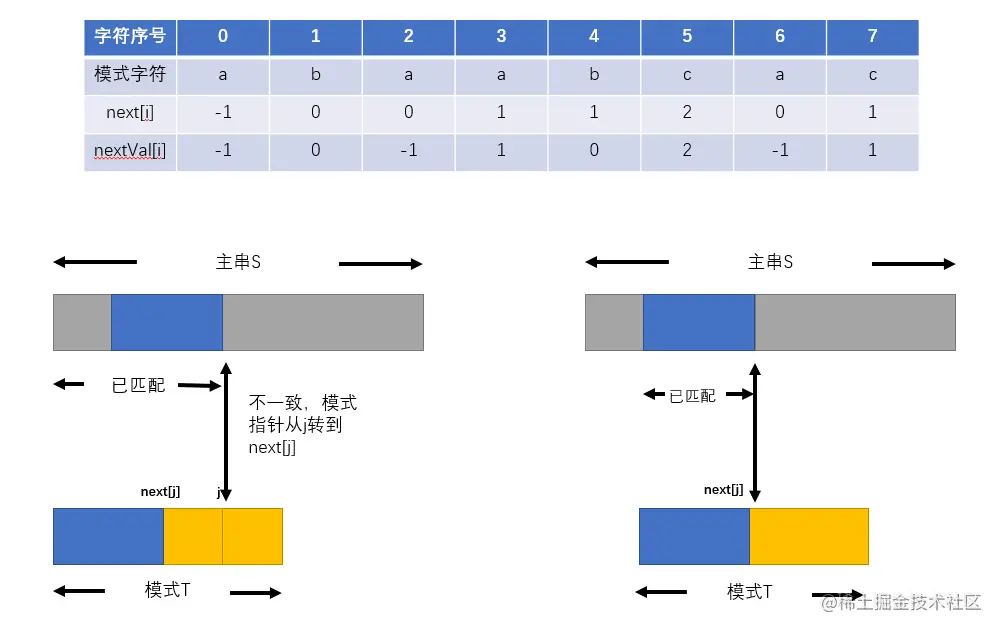 - j = next[i] != -1,表示模式头部到next[i] - 1和主串当前位置的前面next[i] 个字符是匹配的。下一次的匹配是主串的当前位置和模式的next[i]