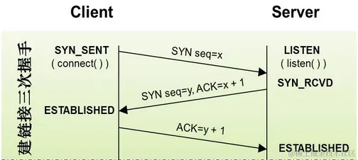 建立连接。Client发送连接请求报文段,将SYN位置为1,Sequence Number为x;然后,客户端进入SYN_SEND状态,等待服务器的确认;