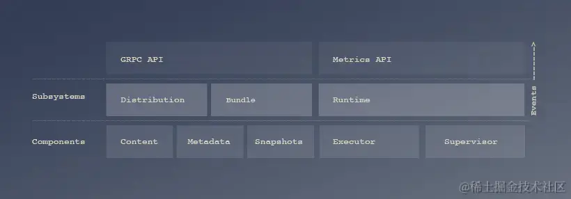 - Distribution用于容器镜像的pull和push动作(这部分出现在Containerd中完全是因为OCI v1标准推出Docker公司将自己镜像格式贡献了出去,所以containerd理所当然需要对镜像进行管理了)。