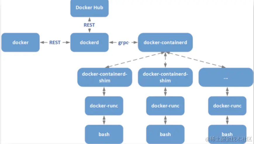容器镜像的下载是由dockerd完成的,但容器的创建和运行就需要containerd(docker-containerd) 来完成了。Dockerd与docker-containerd之间是通过grpc协议通信的。