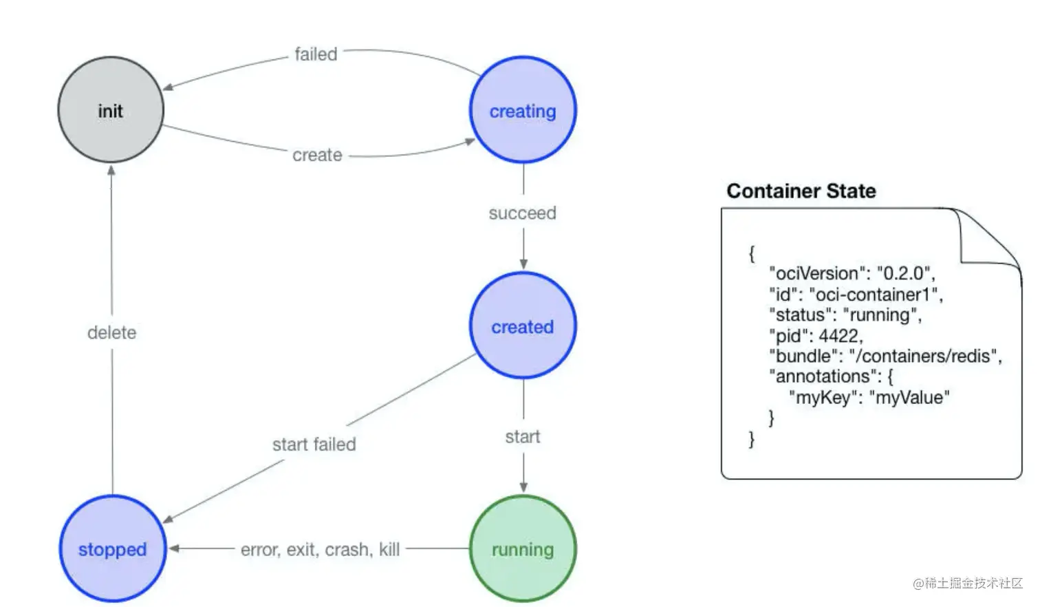 - 容器文件目录:存放容器rootfs及相应配置的目录。外部程序只需读取state.json就可以定位到宿主机上的容器文件目录。 标准的容器生命周期应该包含三个基本过程。
