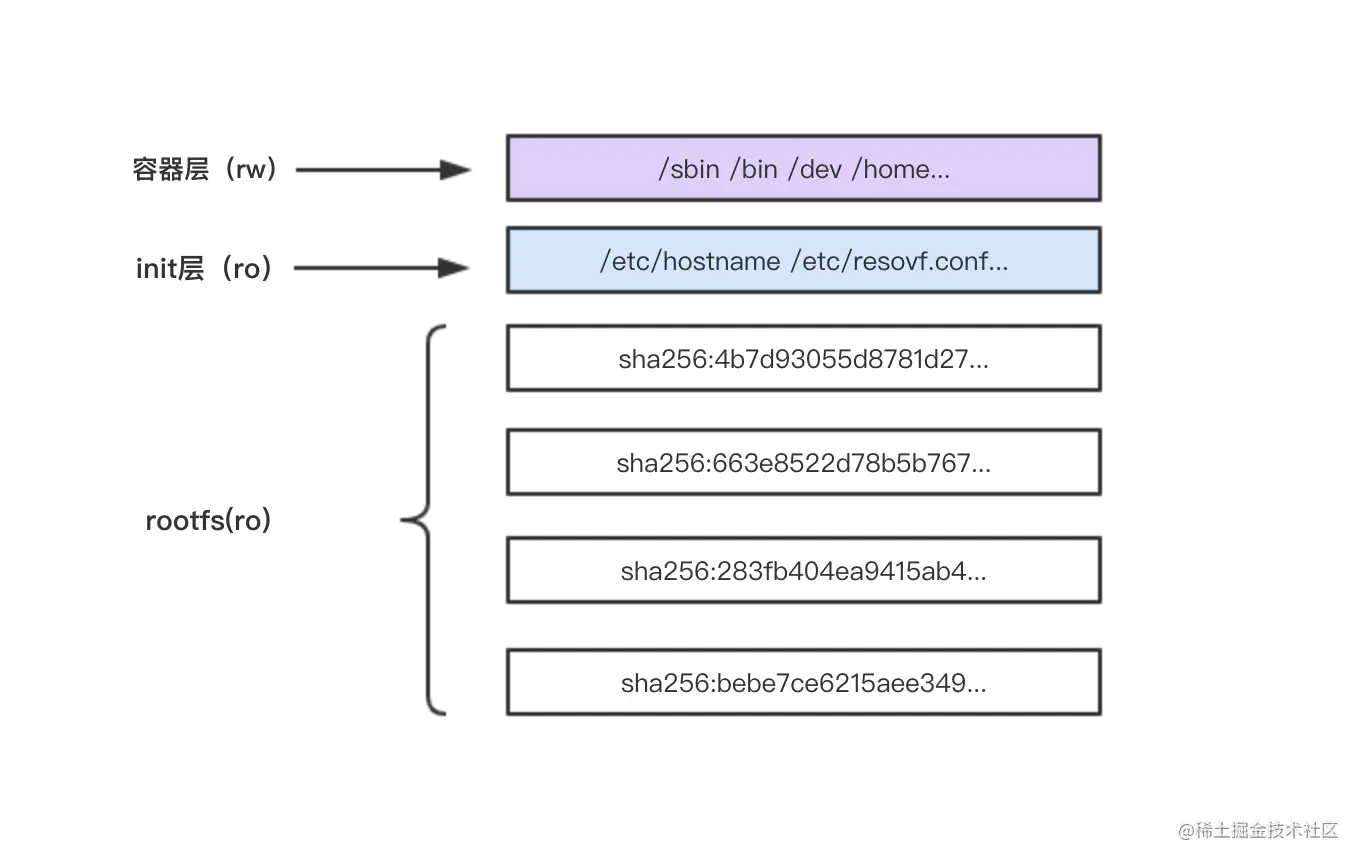 镜像层:也称为rootfs,提供容器启动的文件系统 init层: 用于修改容器中一些文件如/etc/hostname、/etc/resolv.conf等容器层:使用联合挂载统一给用户提供的可读写目录