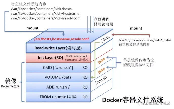 读写层: Docker容器内的进程只对可读写层拥有写权限,其他层对进程而言都是只读的(Read-Only)。 另外,关于VOLUME以及容器的hosts、hostname、resolv.conf文件等都会挂载到这里。